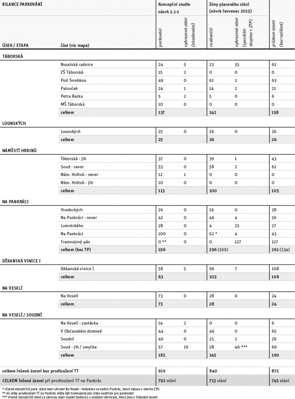 Přesná čísla i z dalších oblastí jsou uvedena v tabulce (Celá tabulka je v galerii). První sloupeček uvádí počet parkovacích míst po revitalizaci a poslední sloupeček zaznamenává počet parkovacích míst před rozšířením. Uprostřed jsou uvedena čísla o počtu rezidentů (při případném zavádění modrých zón) z průzkumu, který si nechala vypracovat městká část v červenci 2015.